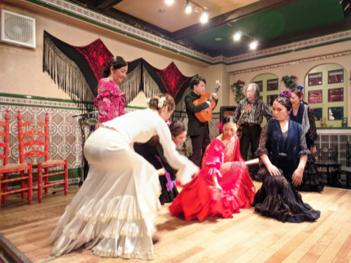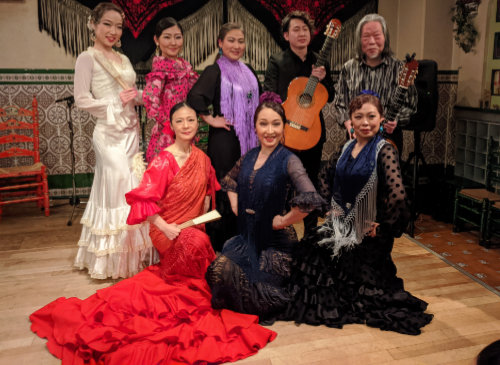 恵さんはそこそこの期間ほかのお教室でフラメンコを踊っていて、お師匠さんが高齢になって教室を閉めたのを期に教室を探してウチの教室に入門しました。それなりにキャリアがあるのですがタブラオに出演したことがないとのことだったので、そういつまでも踊れるものではなし、せっかく若い先生(ってほどでもない(涙))について今時フラメンコ界にアクセスできる環境に移ってきたわけですから、こういうところに出演するのもフラメンコの愉しみの1つとして出演を薦めました。
